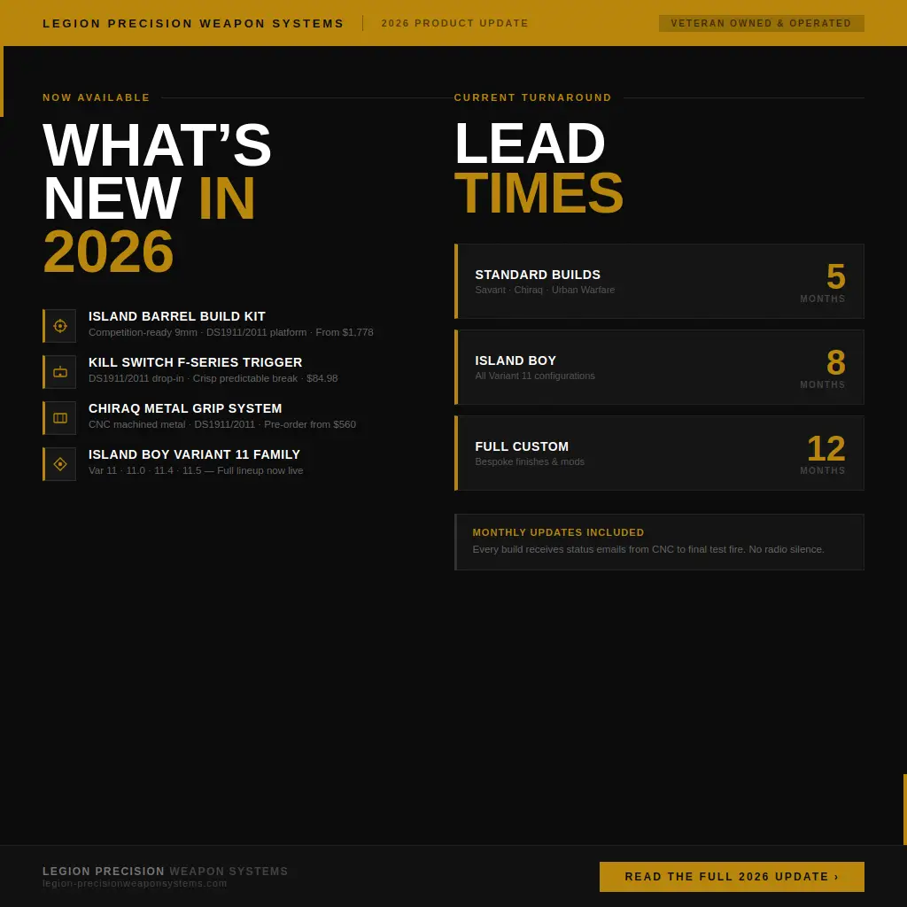 Legion Precision Weapon Systems is a veteran-owned custom firearms shop out of Seguin, Texas. We were built on a simple idea: every firearm deserves to be treated like a precision instrument, not a product off a shelf.